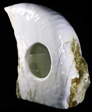 Das innere Bild des Elfenhauses habe ich aus der Wüste mitgebracht. Ich saß dort in einem Stein, der eine kleine natürliche Höhle in sich barg, und fühlte mich glücklich und geborgen. Das Bild des Elfenhauses wuchs in meinem Herzen - und ich musste es nur noch in die Tat umsetzen… Gearbeitet habe ich es aus weißem griechischen Marmor, der von verschiedenartigen Äderungen durchzogen ist und durch seine großen Kristalle sehr transparent wirkt. Es ist ein lebendig wirkendes, leicht durchscheinendes Gebilde entstanden, dessen Außenform an ein Horn oder die Mütze eines Zwerges erinnert. Ich habe große Teile der natürlichen, orangefarbenen Außenhaut des Marmors belassen, wodurch der Eindruck entsteht, das Elfenhaus selber sei so gewachsen. Fast mittig auf der Vorderseite findet sich der kleine, eiförmige Eingang in das Elfenhaus, einladend in weichen, lebendigen Formen gestaltet wie die gesamte Skulptur. Sein kleiner, hellstrahlender Innenraum bietet gerade einem Menschen Platz. Wie hineingewachsen findet sich im Inneren ein kleiner Sims für die diversen wichtigen Elfenutensilien. Dieses Stück ist direkt aus dem Herzen gearbeitet und an den Reaktionen der Betrachter ist zu spüren, dass sie es auch unmittelbar mit dem Herzen verstehen.