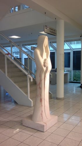 Als Wahrzeichen für das Elisabeth-Krankenhaus in Essen empfängt die überlebensgroße Skulptur aus lachsfarbenem Marmor die Besucher im Haupteingangsfoyer. Es war mein Anliegen den Besuchern unabhängig von ihrer Glaubensrichtung ohne Worte tiefe Menschlichkeit zu vermitteln: Hier bist Du angenommen, aufgehoben mit Deinen Sorgen und Ängsten. Die Rosen weisen die Skulptur als Elisabeth aus, doch ihr Gesicht ist nicht persönlich. Die vollkommene Hingabe der Elisabeth habe ich bildhauerisch übersetzt in ein Fließen von Linie und Form.
